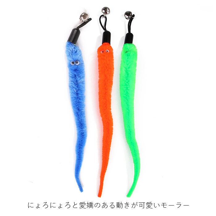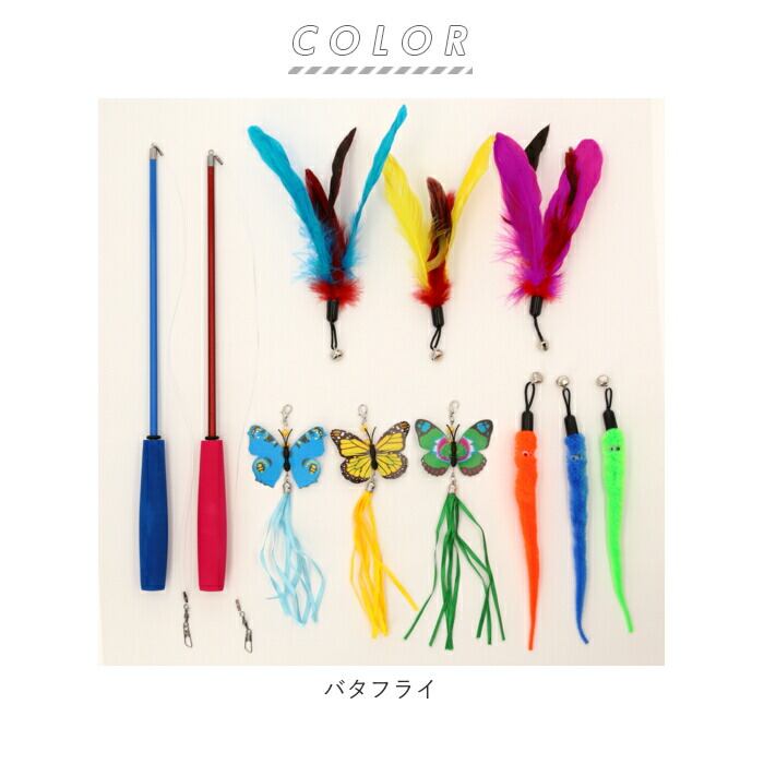 ・本物の羽をカラフルな色に染めたフェザーおもちゃ×3個、色鮮やかなバタフライ×3個、にょろにょろと愛嬌のある動きが可愛いモーラー×3個。合計9つの楽しいおもちゃが付属!