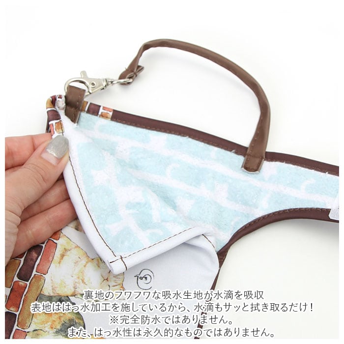 ・裏地のフワフワな吸水生地が水滴を吸収。表地ははっ水加工を施しているから、水滴もサッと拭き取るだけ!(※完全防水ではありません。また、はっ水性は永久的なものではありません。)