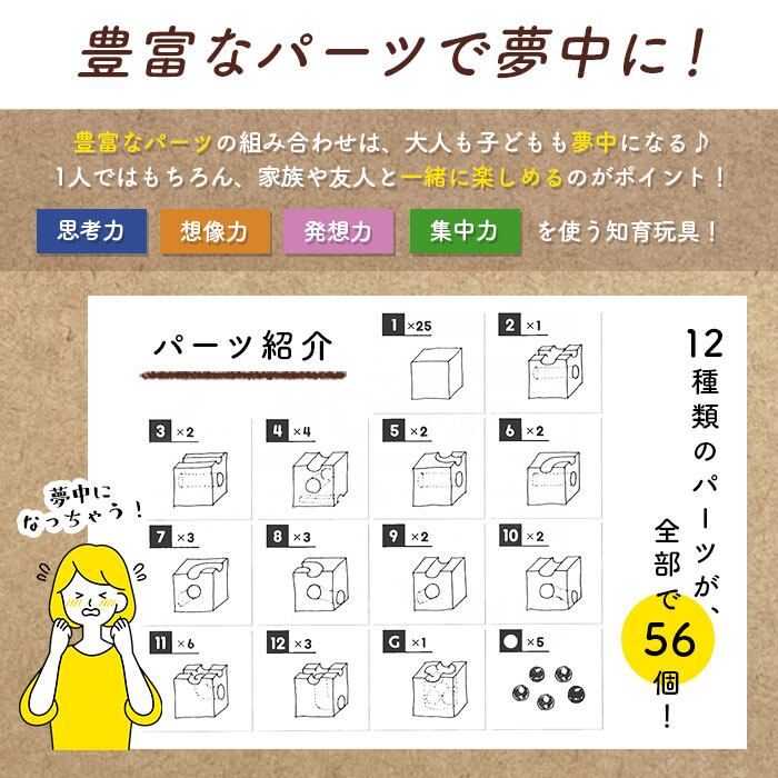 ・思考力・想像力・発想力・集中力を使う知育玩具。12種類のパーツが全部で56個。豊富なパーツの組み合わせは大人も夢中になる難しさ♪1人ではもちろん、家族や友人と一緒に楽しめる!