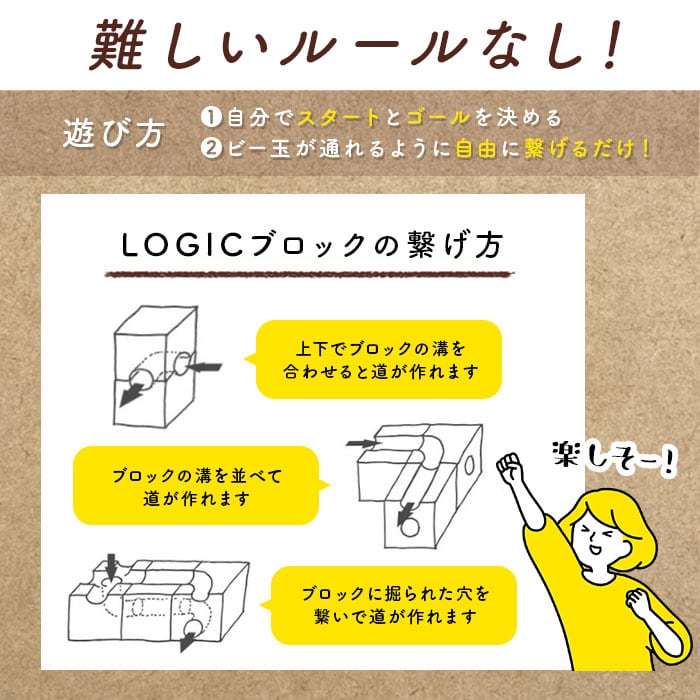 ・難しいルールはなく、穴や溝が彫られているブロックを、自由につなぎ合わせて道を作り、そこにビー玉を転がして遊ぶことができる。自分でスタートやゴールを決めて、ビー玉が通れるようにルートを考え、自分だけの立体迷路を作って遊べる。