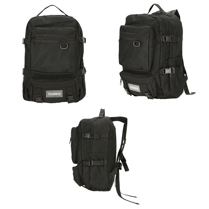 ・フロントにファスナーポケット×3と、両サイドに水筒やペットボトル、折り畳み傘を収納するのに便利なメッシュのオープンポケット付き。