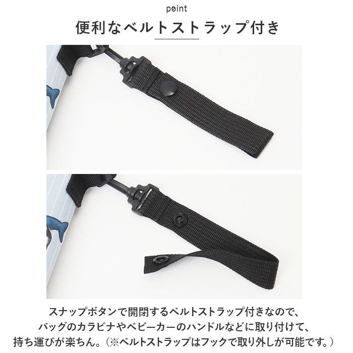 ・スナップボタンで開閉するベルトストラップ付きなので、バッグのカラビナやベビーカーのハンドルなどに取り付けて、持ち運びが楽ちん。(※ベルトストラップはフックで取り外しが可能です。)