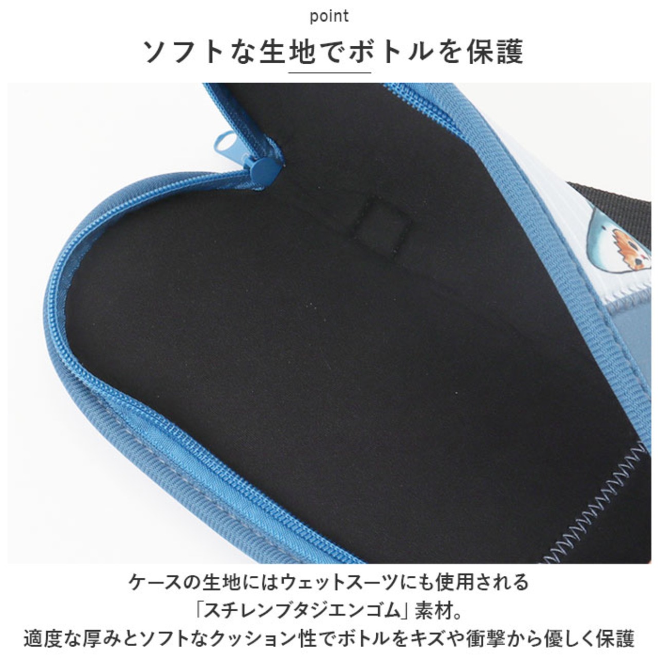 ・ケースの生地にはウェットスーツにも使用される「スチレンブタジエンゴム」素材。適度な厚みとソフトなクッション性でボトルをキズや衝撃から優しく保護。
