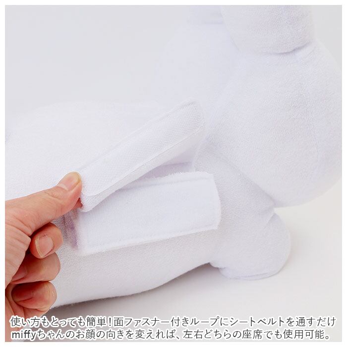 ・使い方もとっても簡単!面ファスナー付きループにシートベルトを通すだけ。miffyちゃんのお顔の向きを変えれば、左右どちらの座席でも使用可能。