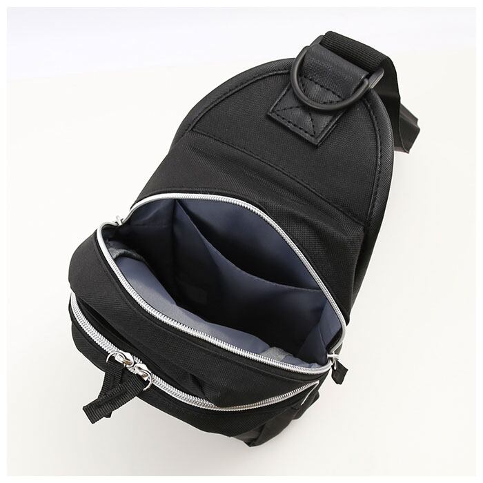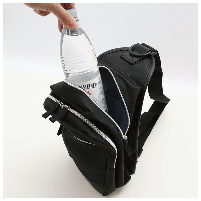 ・メインルーム開口部は、大きく開くラウンドファスナー式。内側は500mlペットボトルや長財布が縦向きに収納可能!オープンポケット×1を装備。