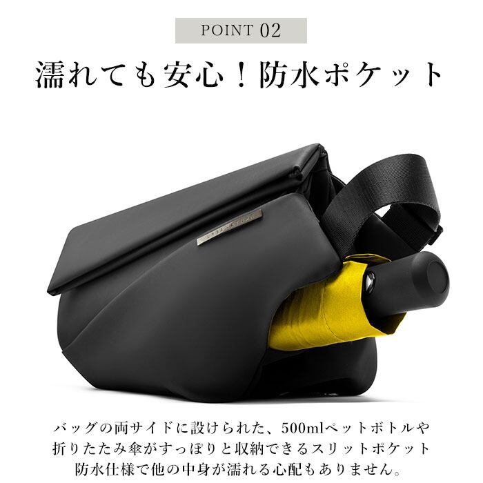 ・バッグの両サイドに設けられた、500mlペットボトルや折りたたみ傘がすっぽりと収納できるスリットポケットが注目ポイント!