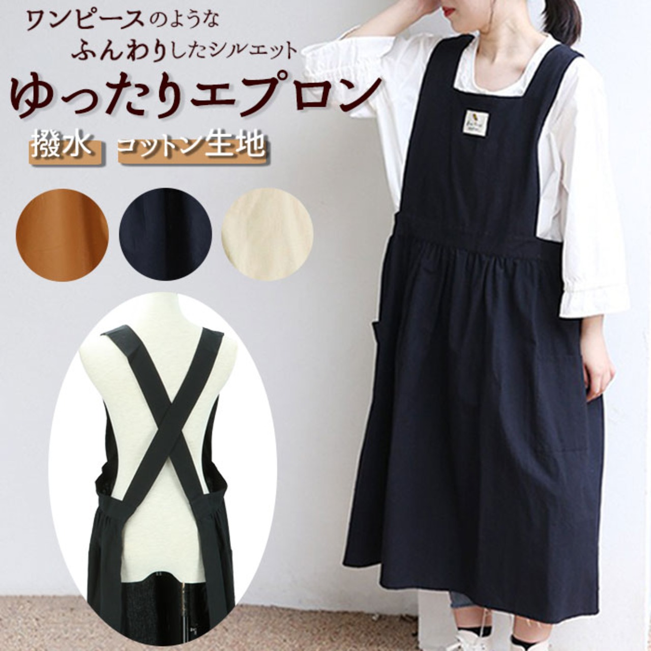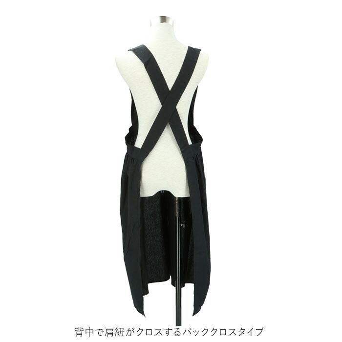 ・背中で肩紐がクロスするバッククロスタイプ。腰ひもを結ぶ必要がなく、すっぽり被るだけ。