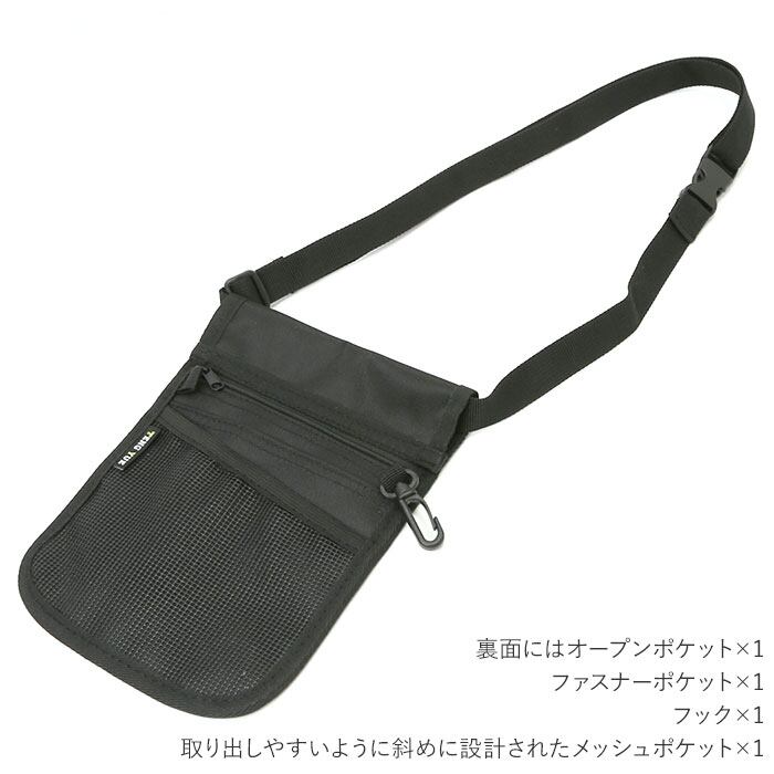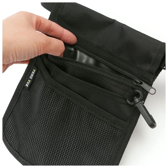 ・裏面は取り出しやすいように斜めに設計されたメッシュポケット×1、オープンポケット×1、ファスナーポケット×1、フック×1。