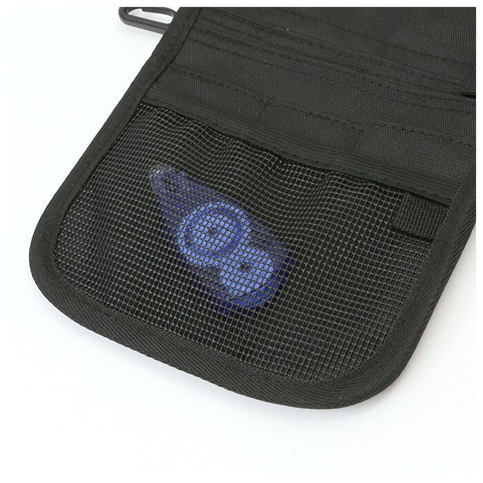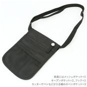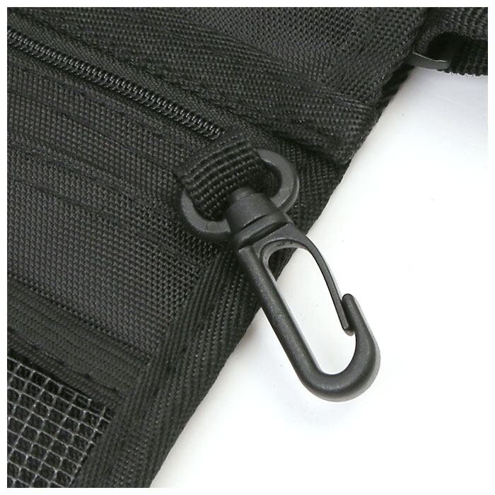 ・表面にはメッシュポケット×1、カッターやペンなどが入る細めのペンポケット×3、オープンポケット×2、フック×1を装備。