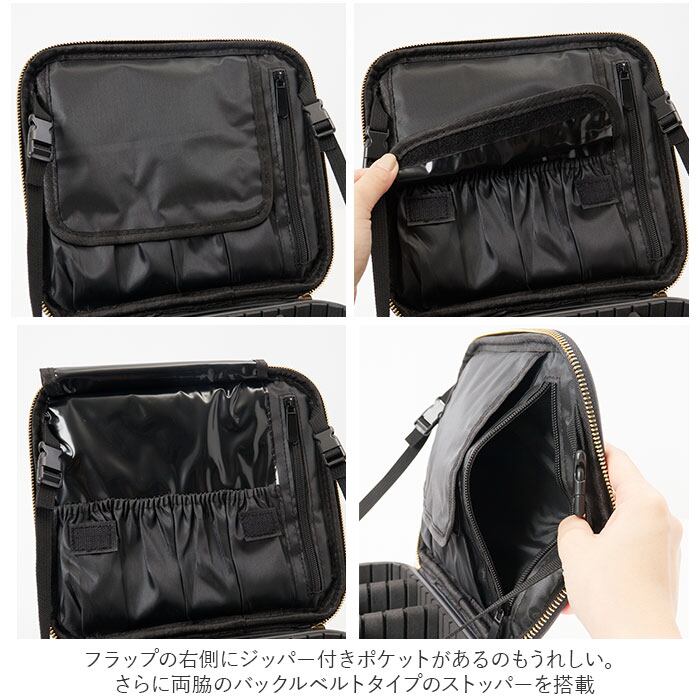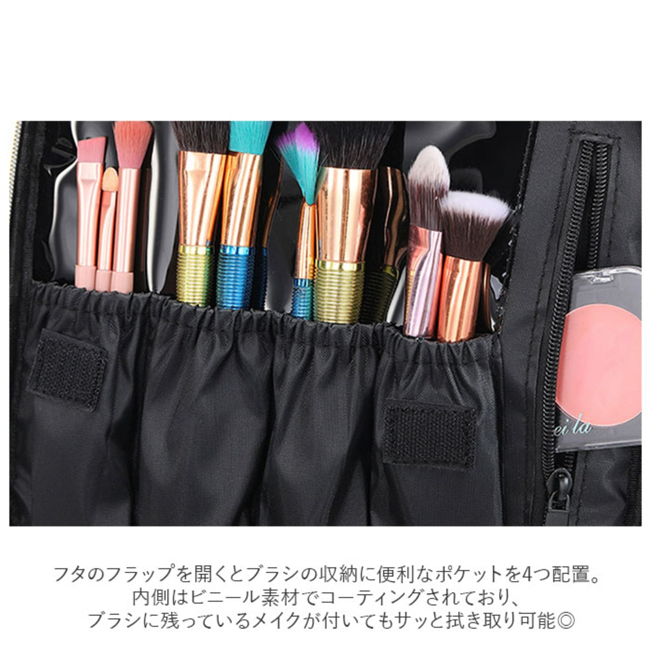 ・フタのフラップを開くとブラシの収納に便利なポケットを4つ配置。内側はビニール素材でコーティングされており、ブラシに残っているメイクが付いてもサッと拭き取り可能◎
