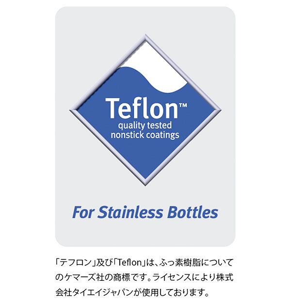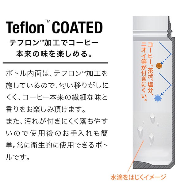 ボトル内面はテフロン加工されており、汚れがつきにくく落ちやすいので衛生的です。