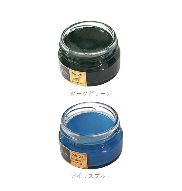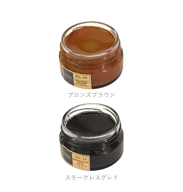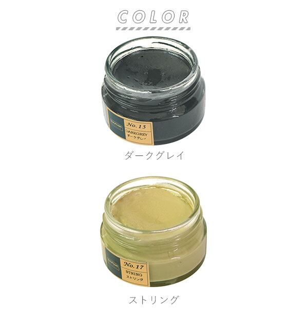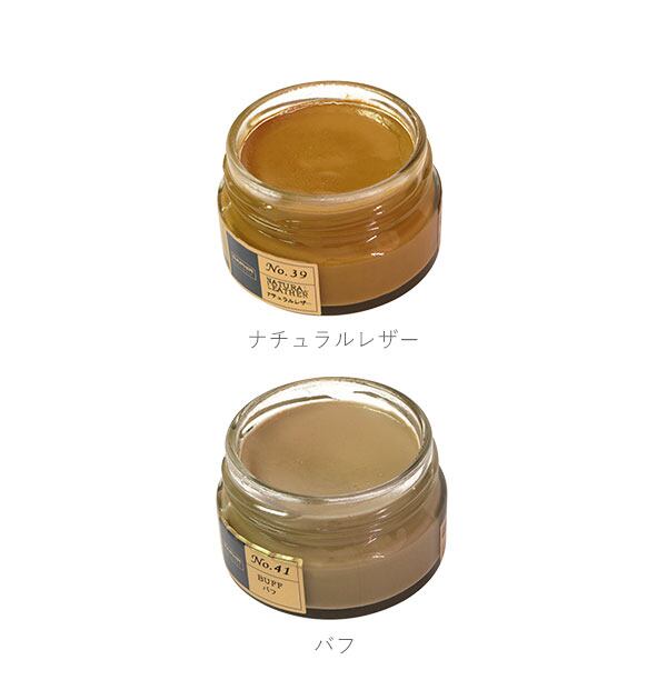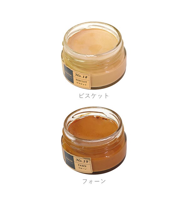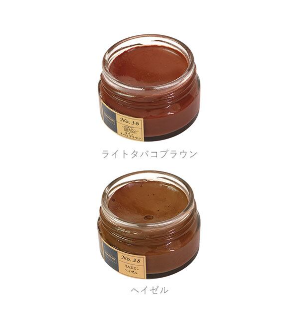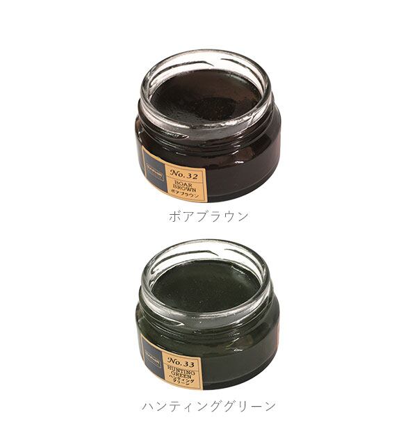 保革効果に優れたビーズワックスベースの、アーモンドオイル配合のツヤ革専用の保革・ツヤ出し高級靴クリームです。伸びの良い乳化性クリームで、染料の定着がよく、補色効果が高いことが特徴です。また、ビーズワックスの配合率が高く、革に対する、栄養・保革効果、光沢・汚れ落とし効果があります。全19色の豊富なカラーバリエーションを取り揃えておりますので、お手持ちのアイテムの色に合わない場合は、複数のカラーを混ぜ合わせてお好みのカラーを作ることもできます。ご愛用の革靴製品のお手入れにぴったりです。