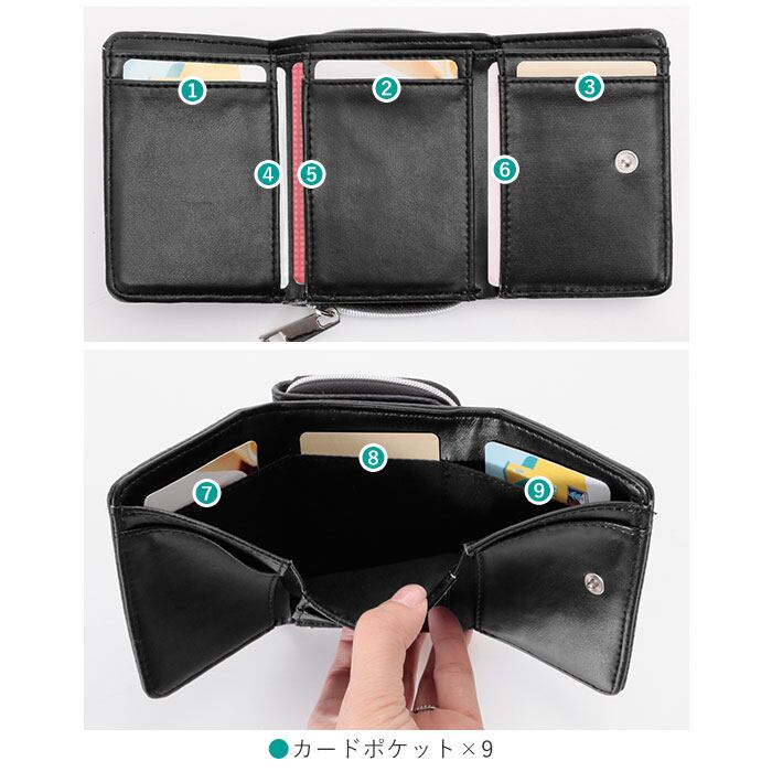 ・小さいサイズでも、小銭入れ×1、お札入れ×1、カードポケット×9と機能性は抜群!