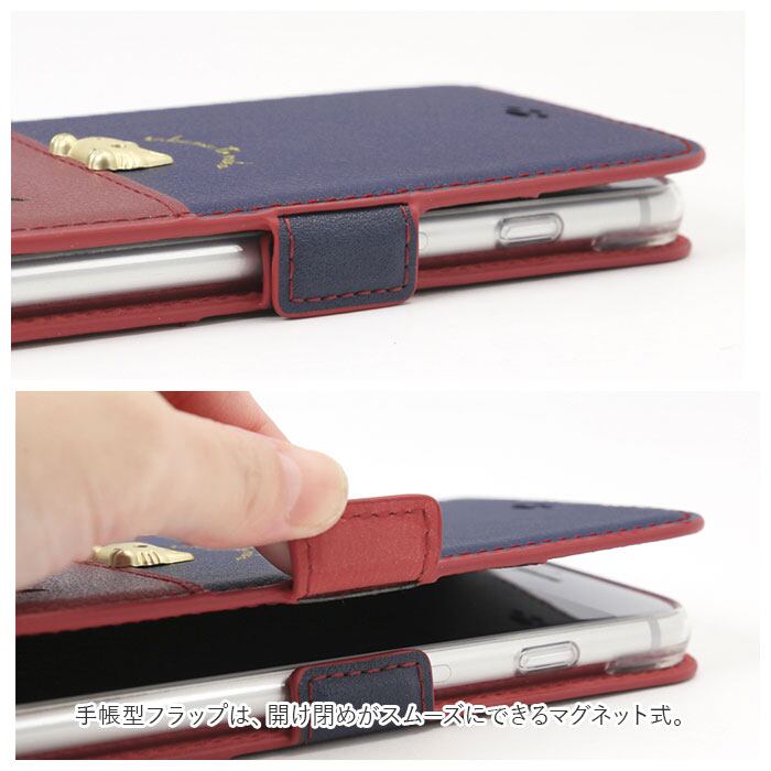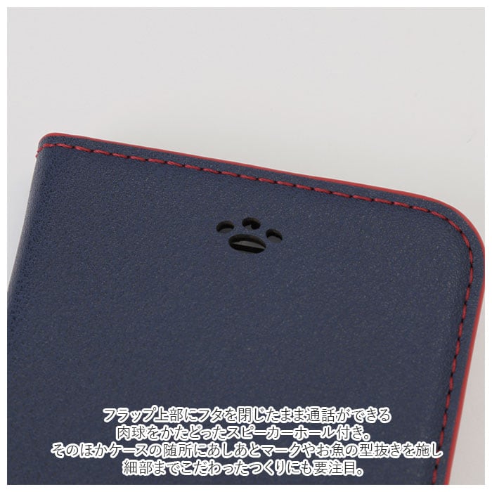 ・フラップ上部にフタを閉じたまま通話ができる、肉球をかたどったスピーカーホール付き。そのほかケースの随所にあしあとマークやお魚の型抜きを施し、細部までこだわったつくりにも要注目。