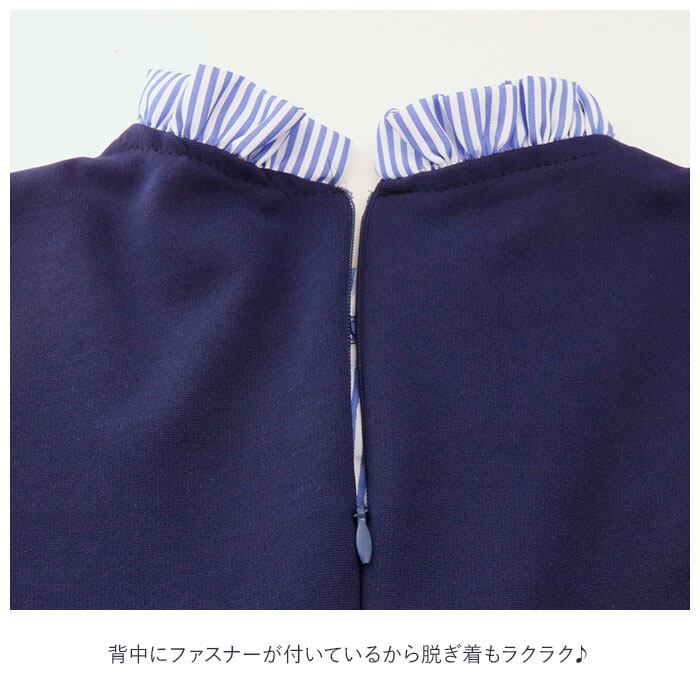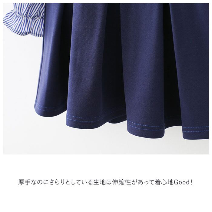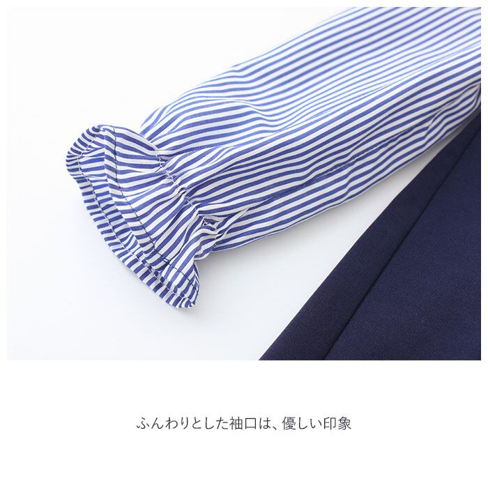 ・落ち着いたネイビーのオーバースカートと爽やかなストライプ柄のブラウスを重ね着しているようなレイヤード感がとっても上品。