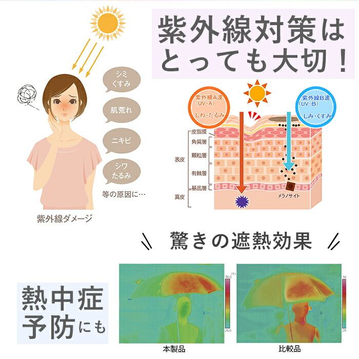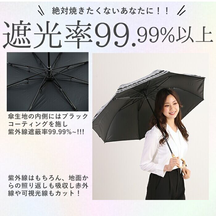 ・傘生地の内側にはブラックコーティングを施し、紫外線遮蔽率99.99%以上!紫外線はもちろん、地面からの照り返しも吸収し、赤外線や可視光線もカット!