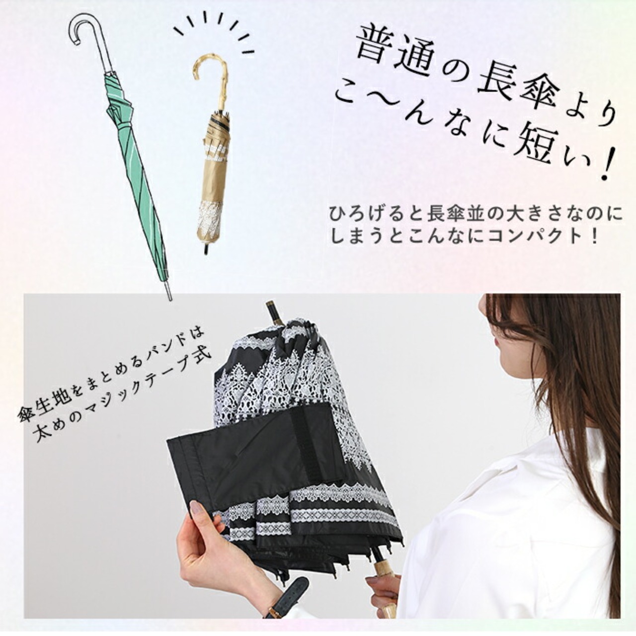 ・ショートワイド傘とは、長傘より短い(ショート)のに、開くと長傘サイズ(ワイド)の傘。小さく持って大きく開く、持ち運びの便利さがポイント!
