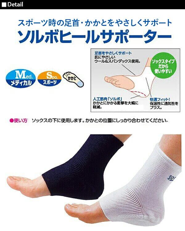 踵部に衝撃吸収素材「ソルボ」を装着したサポーターで踵にかかる衝撃を緩和。脚の痛みをやわらげます。スポーツ等で踵に痛みがある人や、1日中立ち仕事をしている人におすすめします!フィット感を重視したウール&スパンデックス使用のサポーターが足首をしっかりサポートし、ムレを抑えて快適性を保ちます。