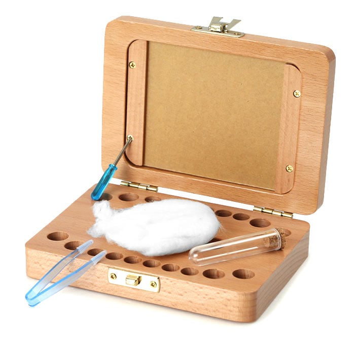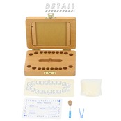 ・乳歯を掴むピンセット、小さな乳歯の固定や深さ調整に便利な脱脂綿、うぶ毛を保存できるミニボトル、写真スペースのネジの開け閉めに必要なミニドライバーも付属。