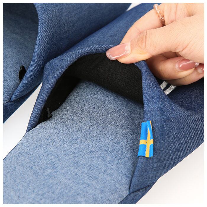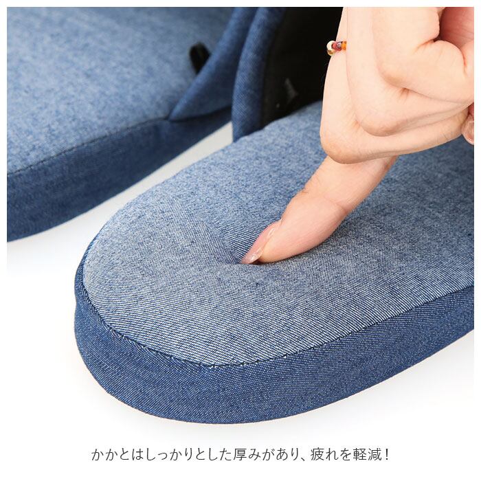 ・スリッパのフォルムに馴染みやすいストレッチデニム生地を採用し、履き心地抜群。かかとはしっかりとした厚みがあり、疲れを軽減!