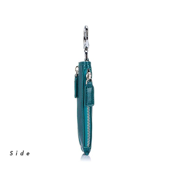 ・本体右側のファスナーポケットは、小銭や折りたたんだお札、ICカード等が収納でき、コインケースとしても使用できる。自動車用スマートキーをフックにつながずに収納したい場合は、こちらのファスナーポケットにも収納可能。