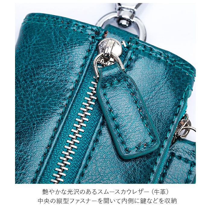 ・ボディに艶やかな光沢のあるスムースカウレザー(牛革)を使用。本格レザーの質感が手のひらに馴染むコンパクトなキーケース。