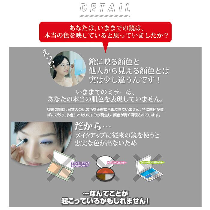 ・肌の白色がくすんで見える従来の鏡に比べて、ナピュアミラーではより透明度の高いガラスを使用することで、色の変化が少なく自然な色表現が可能に♪