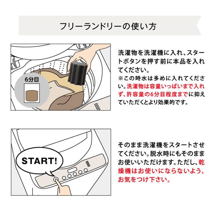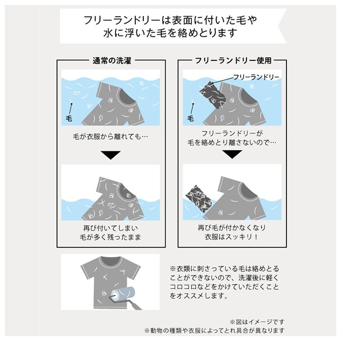 ・使い方はとっても簡単!洗濯機のスタートボタンを押す前にフリーランドリープロを入れておくだけ。洗濯物を容量いっぱいまで入れず、洗濯物が泳ぐ程度に抑えると水に毛が浮いてより効果的!