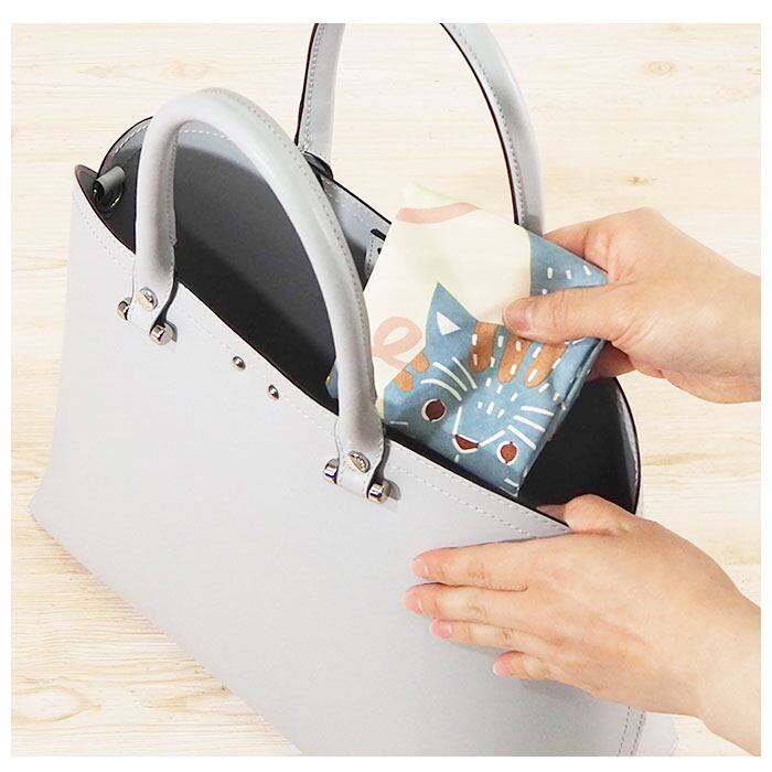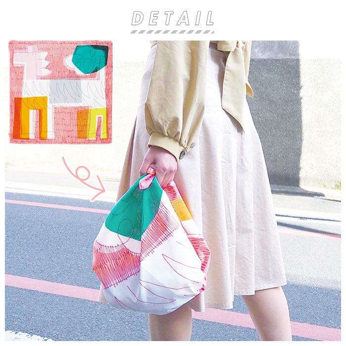 ・70cm×70cmの手頃なサイズ感で、コンビニで買ったおにぎりやサンドイッチ、飲み物がサッと包めて、エコバッグとして大活躍。