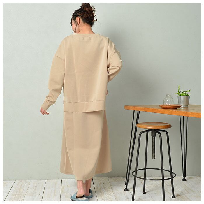 ・軽量で伸縮性があり、上品な光沢とハリ感が特徴のダンボールニット仕上げ!トップスとロングスカートの上下セットが登場。