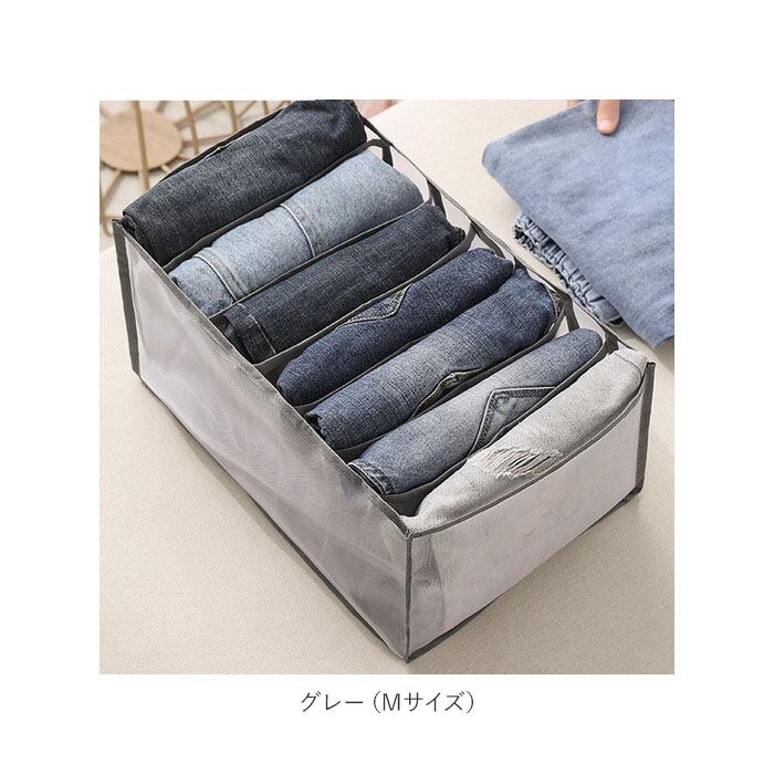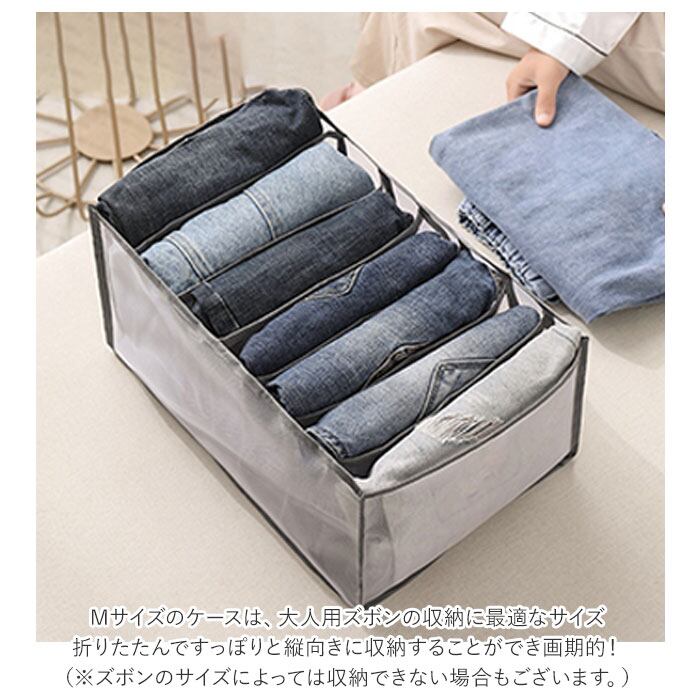 ・Mサイズのケースは、大人用ズボンの収納に最適なサイズ。ジーンズ等のズボン類をパタパタと4つ程度に折りたたんだら、すっぽりと縦向きに収納することができ画期的!(※ズボンのサイズによっては収納できない場合もございます。)
