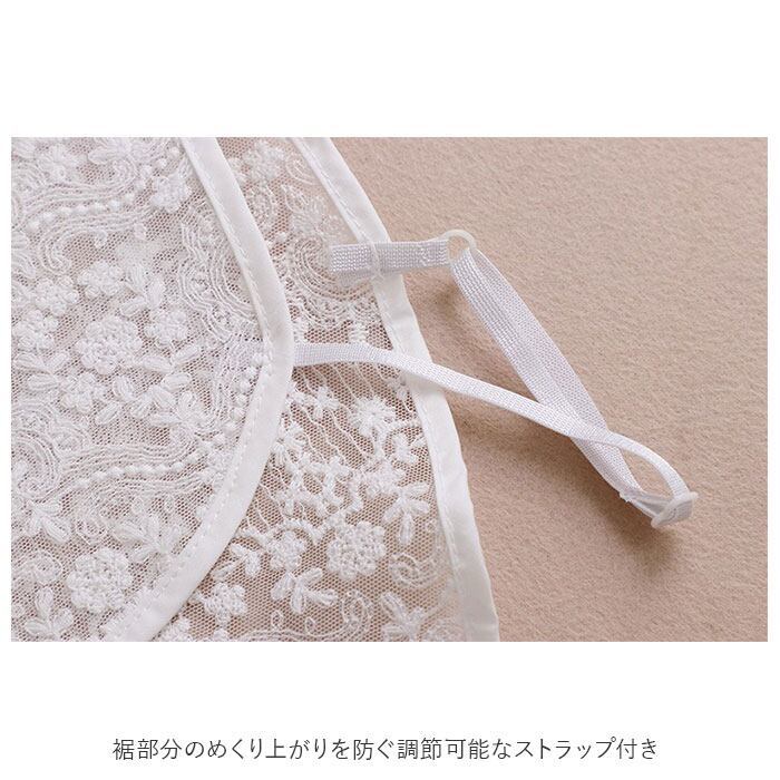 ・裾部分のめくり上がりを防ぐ調節可能なストラップ付き。ストラップを脇の下に通すことで、ストレスなく着用することが可能。