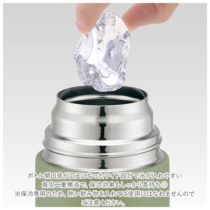 ・キャップユニットを外すとボトル開口部が広口になったワイド設計で、氷が入れやすい。真空二重構造で、保冷効果もしっかり長持ち◎(※保冷専用のため、熱い飲み物を入れてご使用にはなれませんのでご注意ください。)