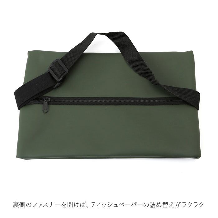 ・裏側のファスナーを開けば、ティッシュペーパーの詰め替えもラクラク。(※一般的なボックスティッシュや、ソフトケースタイプのティッシュがお使いいただけます。詰め替えてご使用ください。)