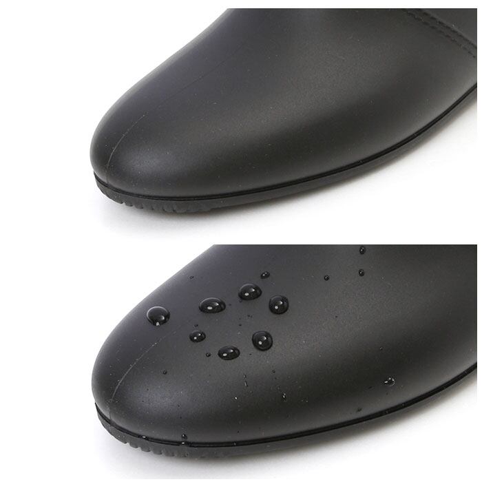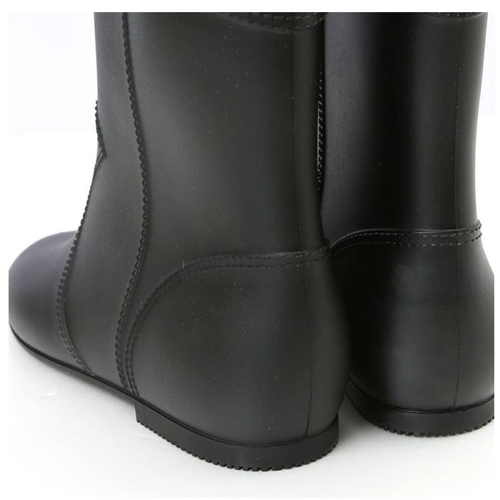 ・水濡れに強いPVC樹脂素材を全面に使用し、ウェルト部分に縫い目のない一体成型で仕上げたレインブーツ。足の甲やかかと、履き口にフェイクステッチを施し、ディテールにこだわったデザインが注目ポイント!