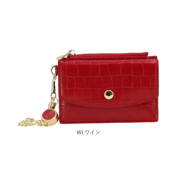 ・艶やかで本革のような本格的な風合いが印象的!クロコ型押しフェイクレザーを使用したリール付きパスケース。