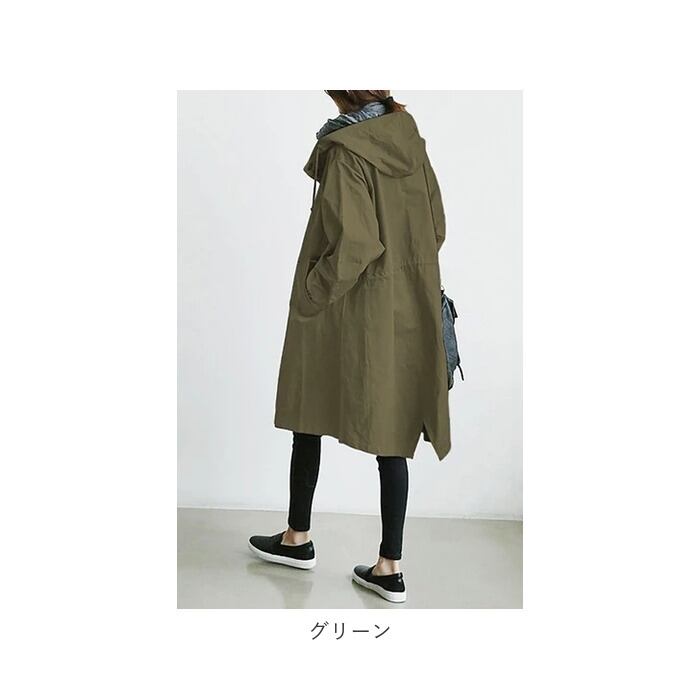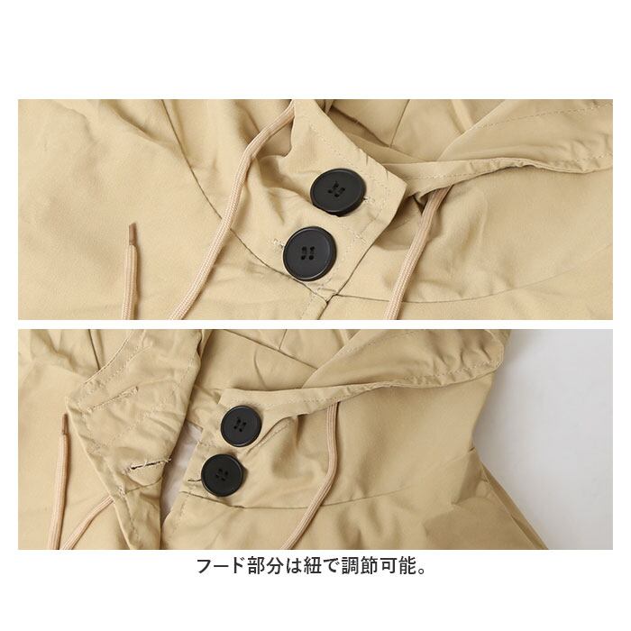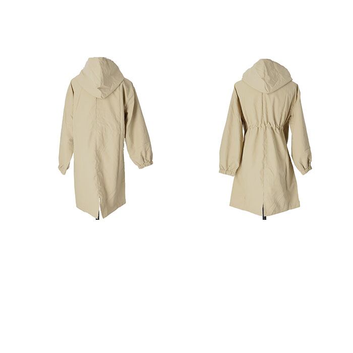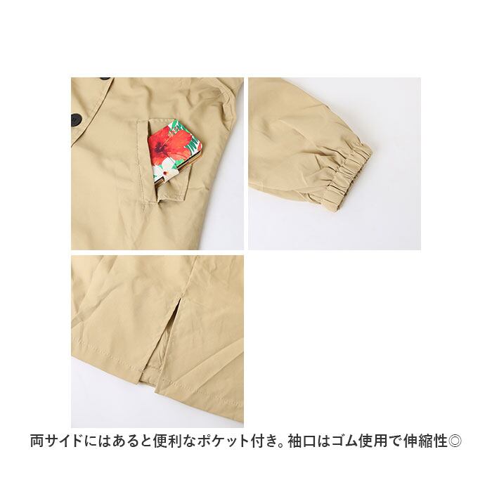・両サイドにはあると便利なポケット付き。袖口はゴム使用で伸縮性あり、フード部分は紐で調節可能。