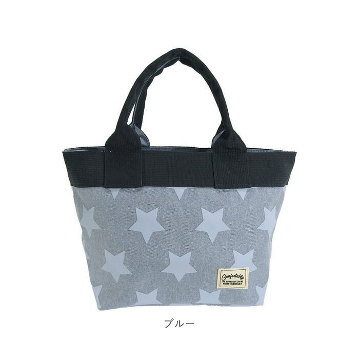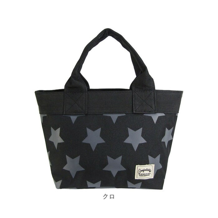 ・ポップなスター柄を散りばめたポリキャンバス素材に、太めのテープ生地の縁取りがワンポイントになったシンプルミニトート。