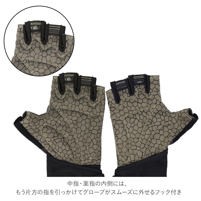 ・中指・薬指の内側には、もう片方の指を引っかけてグローブがスムーズに外せるフック付き。