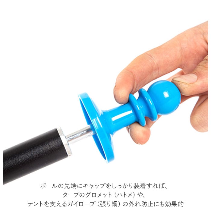 ・ポールの先端にキャップをしっかり装着すれば、タープのグロメット(ハトメ)や、テントを支えるガイロープ(張り綱)の外れ防止にも効果的。