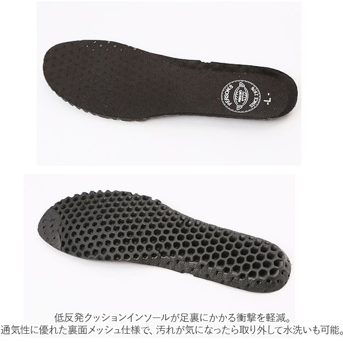 ・低反発クッションインソールが足裏にかかる衝撃を軽減。通気性に優れた裏面メッシュ仕様で、汚れが気になったら取り外して水洗いも可能。
