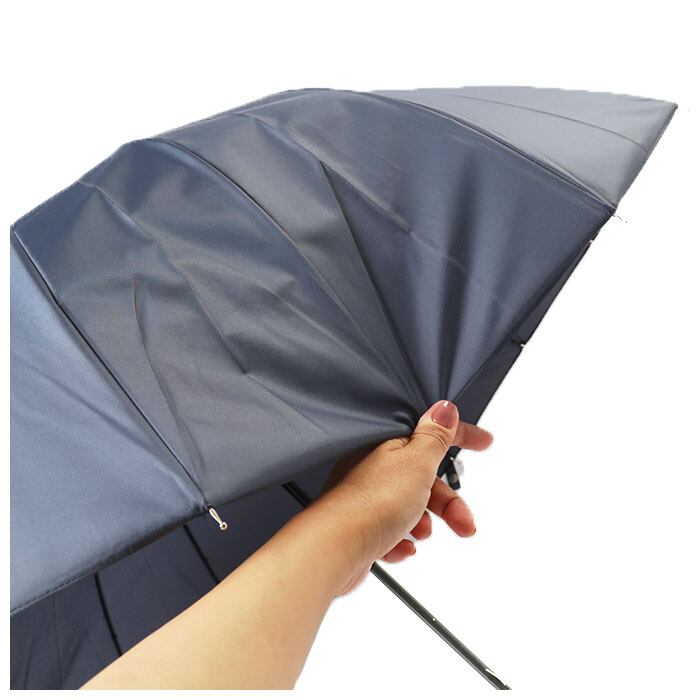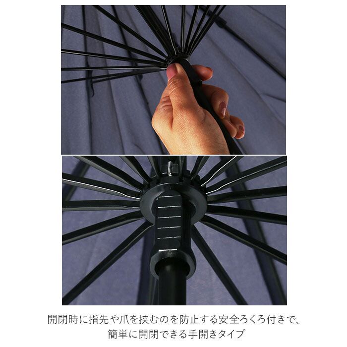 ・親骨に弾力性があり、折れにくいグラスファイバー素材を使用した16本骨仕様。風が少し強めの日でもちゃんとさせて安心。
