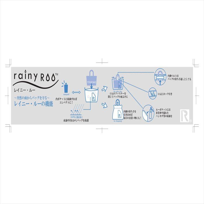 突然の雨からバッグを守る「レイニー・ルー」。表面ははっ水加工なので雨からバッグを守ります。外側のルーポケットには折りたたみ傘や濡れたものの収納に使え、ポケットの底はメッシュ素材で通気も確保。