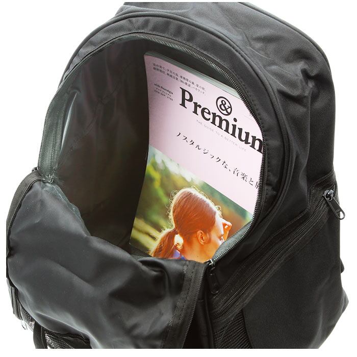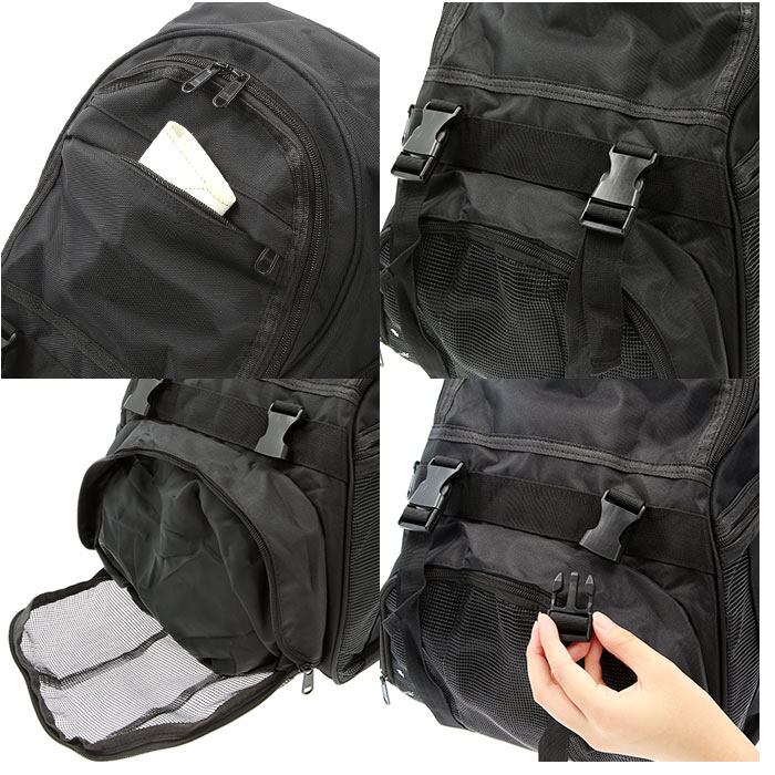 ・ボールが収納できる前面のメッシュポケットはサッカーボールが5号球・バスケットボールが6号球まで収納可能。メイン収納と独立しているので、ボールだけでなく汚れたシューズも入れられる◎