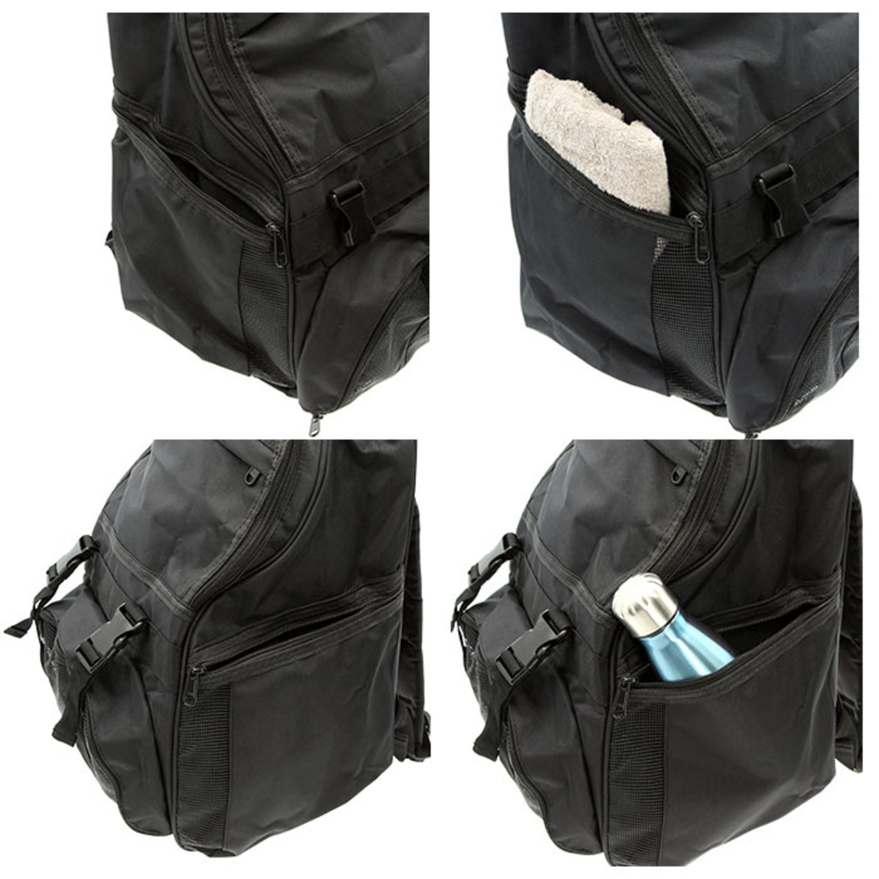 ・両サイドと前面上部はファスナーポケットが付いていて、タオルや飲み物・スマホ等を入れられる。