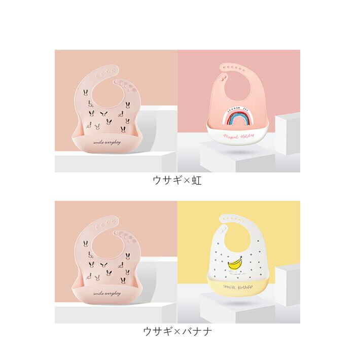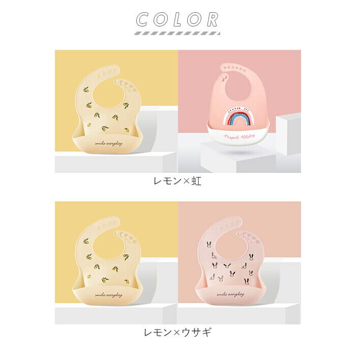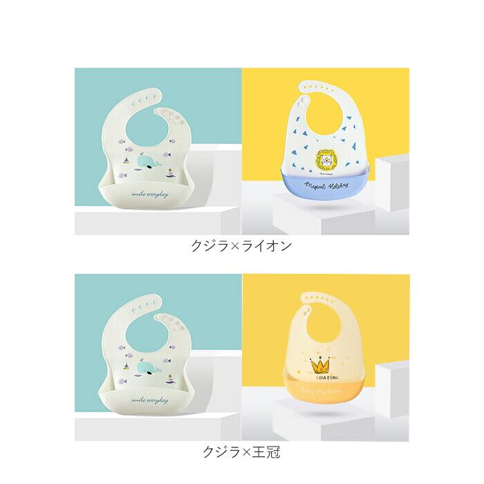 ・お子さまの成長に合わせて、お首のサイズを4段階もしくは6段階に調節可能。離乳食期からひとり食べトレーニングまで、長く使える◎(※レモン・クジラ・ウサギ・恐竜・車は左留め・4段階調整タイプ、虹・バナナ・白鳥・ライオン・王冠は右留め・6段階調整タイプになります。)