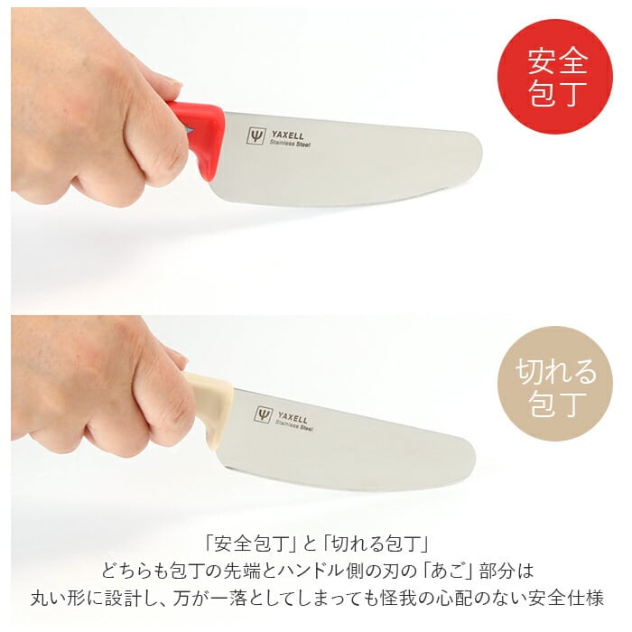 「安全包丁」と「切れる包丁」、どちらも包丁の先端とハンドル側の刃の「あご」部分は丸い形に設計し、万が一落としてしまっても怪我の心配のない安全仕様。