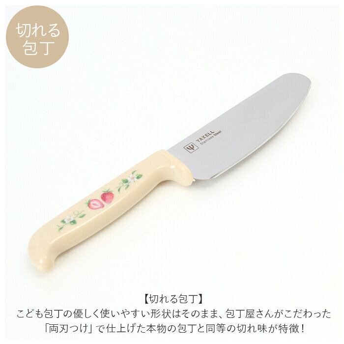 ・こども包丁の優しく使いやすい形状はそのまま、包丁屋さんがこだわった「両刃つけ」で仕上げた本物の包丁と同等の切れ味が特徴!