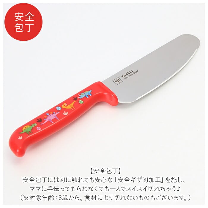 ・安全包丁には刃に触れても安心な「安全ギザ刃加工」を施し、ママに手伝ってもらわなくても一人でスイスイ切れちゃう♪(※対象年齢:3歳から。食材により切れないものもございます。)