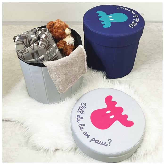・丸いフォルムがかわいらしい、ボックス型のスツール。座面を開けると中は収納スペースに!